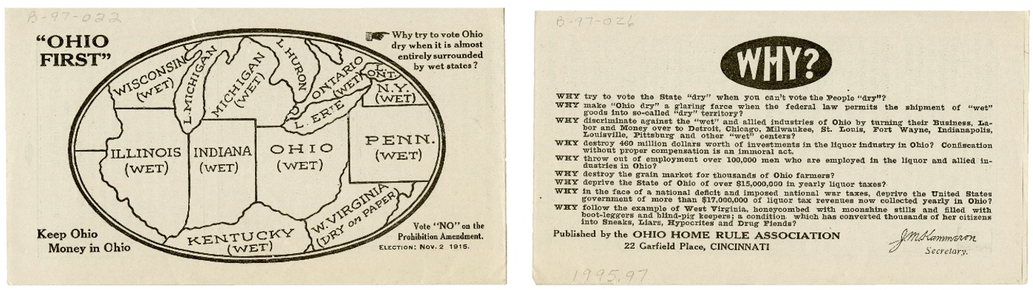 Image 8e: “Ohio First” anti-prohibition flyer, Ohio Home Rule Association, 1915. (Temperance and Abstinence folder, Ephemera Collection, Cincinnati Museum Center)