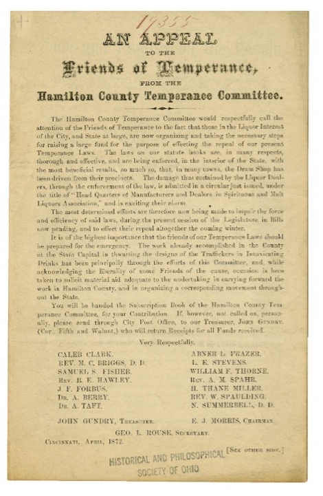 Image 9a: An Appeal to the Friends of Temperance, from the Hamilton County Temperance Committee, 1872. (Temperance and Abstinence folder, Ephemera Collection, Cincinnati Museum Center)
