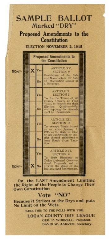 Image 9c: Sample ballot for proposed Ohio state-wide prohibition constitutional amendment, Logan County Dry League, ca. 1915. (Temperance and Abstinence folder, Ephemera Collection, Cincinnati Museum Center)