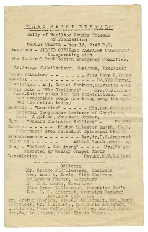 Image 9f: “What Price Repeal?” rally program, Hamilton County Friends of Prohibition, ca. 1933. (Temperance and Abstinence folder, Ephemera Collection, Cincinnati Museum Center)